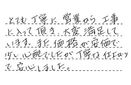 とても丁寧に営業から工事に入って頂き、大変満足しています。また、価格が安価で、少し心配でしたが、丁寧な仕上がりで安心しました。