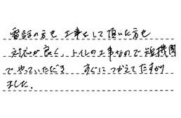 電話の方も工事をして頂いた方も、対応が良く、トイレの工事なので、短期間でやっていただき、すぐにつかえてたすかりました。