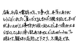 店長、お店の電話の方、工事の方、本当にありがとうございました。「暑いだろう」とせんぷう機を回して、木くずがまい上がり、工事の方が吸い込んでしまい、咳が止まらなくしてしまい、申し訳ありませんでした。明るくて親切に応対して下さり、大満足です。