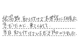 給湯器取り付けでお世話になりました。急だったのに来てくれて、当日取り付けていただき、助かりました。
