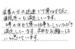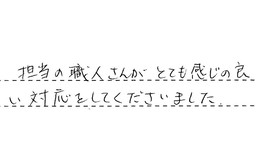 営業の方の迅速で丁寧な対応、値段等にも満足しています。工事の方も丁寧に仕事をしていただき、満足しています。次回もお願いしたいと思っています。