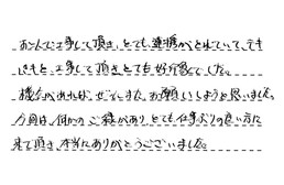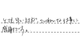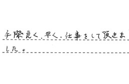 お二人で工事して頂き、とても連携がとれていて、テキパキと工事して頂き、とても好印象でした。機会があれば、ぜひまたお願いしようと思いました。今回は、何かのご縁があり、とても仕事ぶりの良い方に来て頂き、本当にありがとうございました。