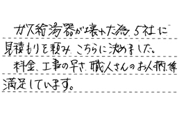 ガス給湯器が壊れた為、5社に見積もりを頼み、こちらに決めました。料金、工事の早さ、職人さんのお人柄、等満足しています。