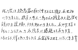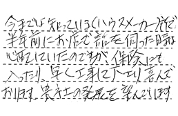 今までは知っている(ハウスメーカー)所で、半年前にお店で話を伺った時は心配していたのですが、保険にも入ったり、早く工事して下さり喜んでおります。貴社の発展を望んでいます。
