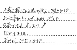 お店を探している時に教えて頂きました。お仕事がとっても、きれいでした。後片づけもすっきり!助かりました。有がとうございました。