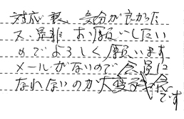 対応、良、気分が良かった。又、是非お願いしたいのでよろしく願います。メールがないので会員になれないのが大変残念です。