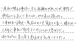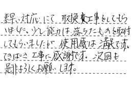 一度、取り換え工事後に少し水漏れがあったが、電話で連絡したら直ぐに来てくれ、やり直して治った。工事担当の渡辺一馬君はとても気立ての良い、暖かい人柄で、本当に気持ちよくやってくれて良かった。通りすがりに良い店を見付けてラッキーでした。