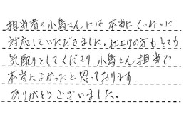 担当者の小島さんには、本当にていねいに対応していただきました。仕上げの方も、とても気配りをしてくださり、小島さん担当で本当によかったと思っております。ありがとうございました。