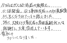 今回はガス給湯器の取替え。①価格面、②工事担当者への社員教育が良くなされていると感じました。特に、大阪エリア責任者の高田真嗣氏には感謝し、大変満足しています。貴社のファンになりました。