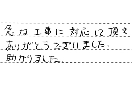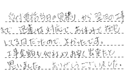 受付電話当日の見積りから翌日の工事まで迅速な対応で、お休みで在宅してる日だったのでよかったです。工事金額も他社よりお安く出来たと思いました。ありがとうございました。
