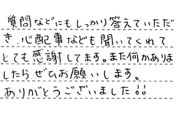 質問などにもしっかり答えていただき、心配事なども聞いてくれてとても感謝してます。また何かありましたらぜひお願いします。ありがとうございました!!