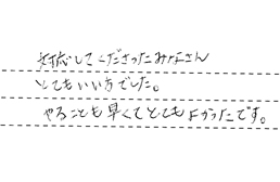 担当の安江さんと納得がいくまで工事内容についての打ち合わせがあったお陰で、当日はスムーズに工事ができました。職人さんも丁寧な仕事をしていただき、感じの良い方で大変満足しています。ありがとうございました。