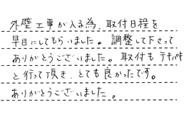 取付工事日等、無理をお願いしましたが、快く引受けて頂き、感謝しています。