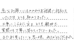 急なお願いにもかかわらず、迅速に対応していただき、とても助かりました。工事にこられた方も、とても親切で、質問にも丁寧に答えてくださいました。また利用したいと思います。ありがとうございました。