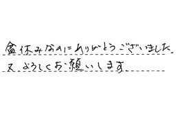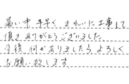 暑い中、手早くきれいに工事して頂き、ありがとうございました。今後なにかありましたら、よろしくお願い致します。