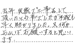 去年実家で工事をして頂いたとの事でしたが手配も早く助かりました。又何かあればお願いすると思います。