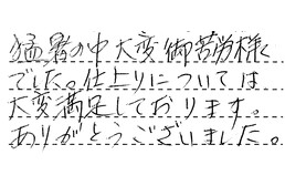 猛暑の中、大変御苦労様でした。仕上りについては、大変満足しております。ありがとうございました。