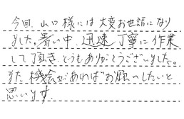 今回、山口様には大変お世話になりました。暑い中、迅速・丁寧に作業して頂き、どうもありがとうございました。また機会があれば、お願いしたいと思います。
