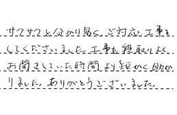 サクサクと分かり易く、ご対応、工事をしてくださいました。工事も段取りよく、お聞きしていた時間より短く、助かりました。ありがとうございました。