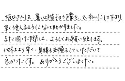 坂口さんは、暑い2階での作業を、ていねいにして下さり、早く使えるようになって助かりました。また困った際は、よろしくお願い致します。他社より早く、見積も交換もしていただいて、良かったです。ありがとうございました。