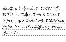 我が家の立場に立って、アドバイス等頂きました。工事も丁ねいにこだわって、とりつけて頂き、大満足です。EDIONさんも見てきましたが、こちらにお願いしてよかったと思っています。