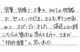 営業・見積り・工事と、ひとりの担当者でやっていただき、とても判りやすくなって、スピーディーでした。満足しています。こちらの質問も答えてもらい、さすが“技術営業”と思いました。