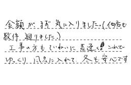 金額がまず気に入りました。(他店も数件廻りました。)工事の方もていねいに素早く、これでゆっくり風呂に入れて、冬も安心です。