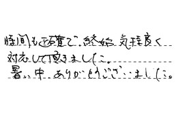 時間も正確で、終始気持良く対応して頂きました。暑い中、ありがとうございました。