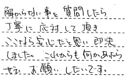 解からない事を質問したら、丁寧に応対して頂き、ここなら安心だと思い、即決しました。これからも何かあったら、ぜひお願いしたいです。