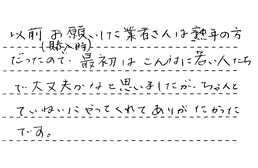 以前お願いしていた業者さんは、熟年の方だったので、最初はこんなに若い人たちで大丈夫かなと思いましたが、ちゃんとていねいにやってくれて、ありがたかったです。