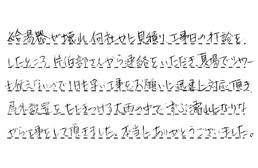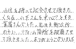 自信を持って紹介させて頂きたくなる山下さんを中心とする業者さんでした。先日もご近所の方に、リフォーム箇所を披露させて頂きました。ありがとうございました。