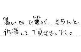 給湯器が壊れ、何社かに見積もり、工事日の打診をしたところ、片伯部さんから連絡をいただき、夏場でシャワーも使えないので、1日も早い工事のお願いに迅速に対応頂き、屋外設置をたたきつける大雨の中で、ずぶ濡れになりながら工事をして頂きました。本当にありがとうございました。