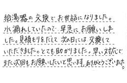給湯器の交換でお世話になりました。水漏れしていたので、早急にお願いしました。見積もりをだして、次の日には交換していただきました。とても助かりました。早い対応で、また次回もお願いしたいと思います。ありがとうございました。