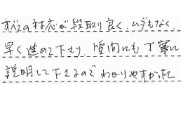 親切、丁寧に仕事をしていただいて、気持ち良かった。作業も早く片づいて、仕上がりもきれいに出来ました。