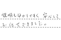 見積りの時に言われた工事時間きっちりで終えられたので、すばらしいと思いました。使い方等、説明もていねいで大変満足です。ありがとうございました。