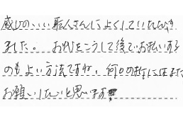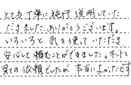 とても丁寧に施工、説明していただきました。ありがとうございます。いろいろと気を使っていただき安心して頼むことができました。ネットを見ての依頼でしたが、本当によかったです。
