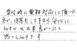受付時に電話対応して頂いた方が、作業もして下さり、安心しておまかせ出来、良かったと思っております。