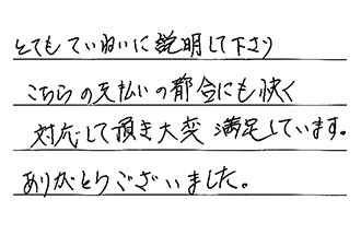 とてもていねいに説明して下さり、こちらの支払いの都合にも快く対応して頂き、大変満足しています。ありがとうございました。