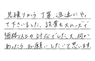 見積りから、丁寧・迅速にやって下さいました。設置もスムーズで、価格以上の対応でした。又、何かあったら、お願いしたいと思います。