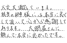 大変満足しています。担当の榊様には、本当に良くして頂いて、心から感謝しております。大問屋さんに頼んで本当に良かったです。