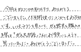 今回は、ガラスコンロの取り付け、ありがとうございました。15年間使ったコンロともお別れです。いつもチラシを見ていて、ガス器具を購入の際は、「ガス大問屋」さんにお願いしようと思っていました。ありがとうございました。
