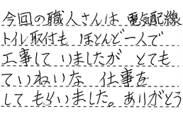 今回の職人さんは、電気配線、トイレ取付も、ほとんど一人で工事していましたが、とてもていねいな仕事をしてもらいました。ありがとう。