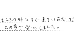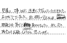 見積り、工事ともに、迅速に対応していただきました。ありがとうございました。また、担当の兒玉さんは、細かい相談にも応えていただけて、助かりました。また、次の機会にも、お願いしようかと思っています。
