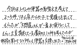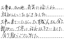 工事日、その他希望に沿うよう、対応していただきました。工事に来ていただいた職人さん全て、親切に丁寧に対応して下さいました。有り難うございました。