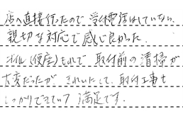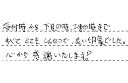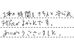 受付時から、下見の時、工事の時まで、すべて、とてもしんせつで、良い印象でした。心から感謝いたします!