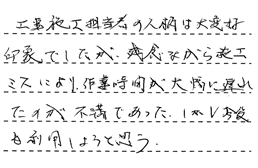 工事施工担当者の人柄は大変好印象でしたが、残念ながら、施工ミスにより、作業時間が大幅に遅れたのが、不満であった。しかし、今後も利用しようと思う。