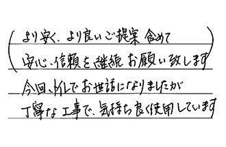 より安く、より良いご提案を含めて、安心・信頼を継続、お願い致します。今回、トイレでお世話になりましたが、丁寧な工事で、気持ち良く使用しています。