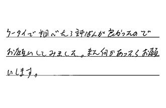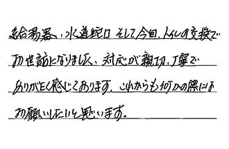 給湯器・水道蛇口、そして今回、トイレの交換でお世話になりました。対応が親切・丁寧で、ありがたく感じております。これからも何かの際には、お願いしたいと思います。