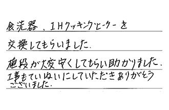 食洗機、IHクッキングヒーターを交換してもらいました。値段を大変安くしてもらい、助かりました。工事もていねいにしていただき、ありがとうございました。