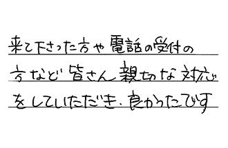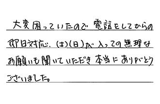 大変困っていたので、電話をしてからの即日対応、(土)(日)が入っての無理なお願いも聞いていただき、本当にありがとうございました。